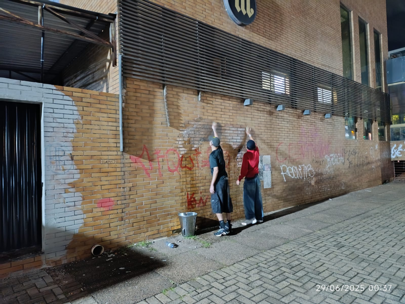 Dois jovens de 18 anos foram flagrados pichando as paredes externas de uma empresa localizada na esquina da Rua Paraná com a Rua Pio XII, em Cascavel. A ação foi registrada por câmeras de monitoramento do estabelecimento, e o próprio empresário acionou a Guarda Municipal pelo canal 153.