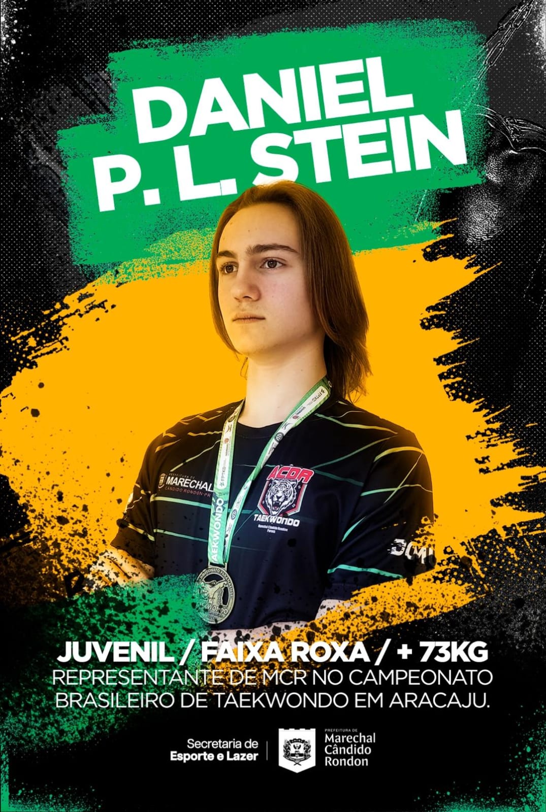 O jovem atleta rondonense Daniel Pedro Lermen Stein, 16 anos, foi convocado pela Federação Paranaense de Taekwondo para representar o Estado no Super Campeonato Brasileiro, que acontece de 10 a 14 de setembro, em Aracaju (SE). Competindo na categoria Juvenil, faixa roxa, acima de 73 kg, ele é um dos destaques do esporte no Paraná.