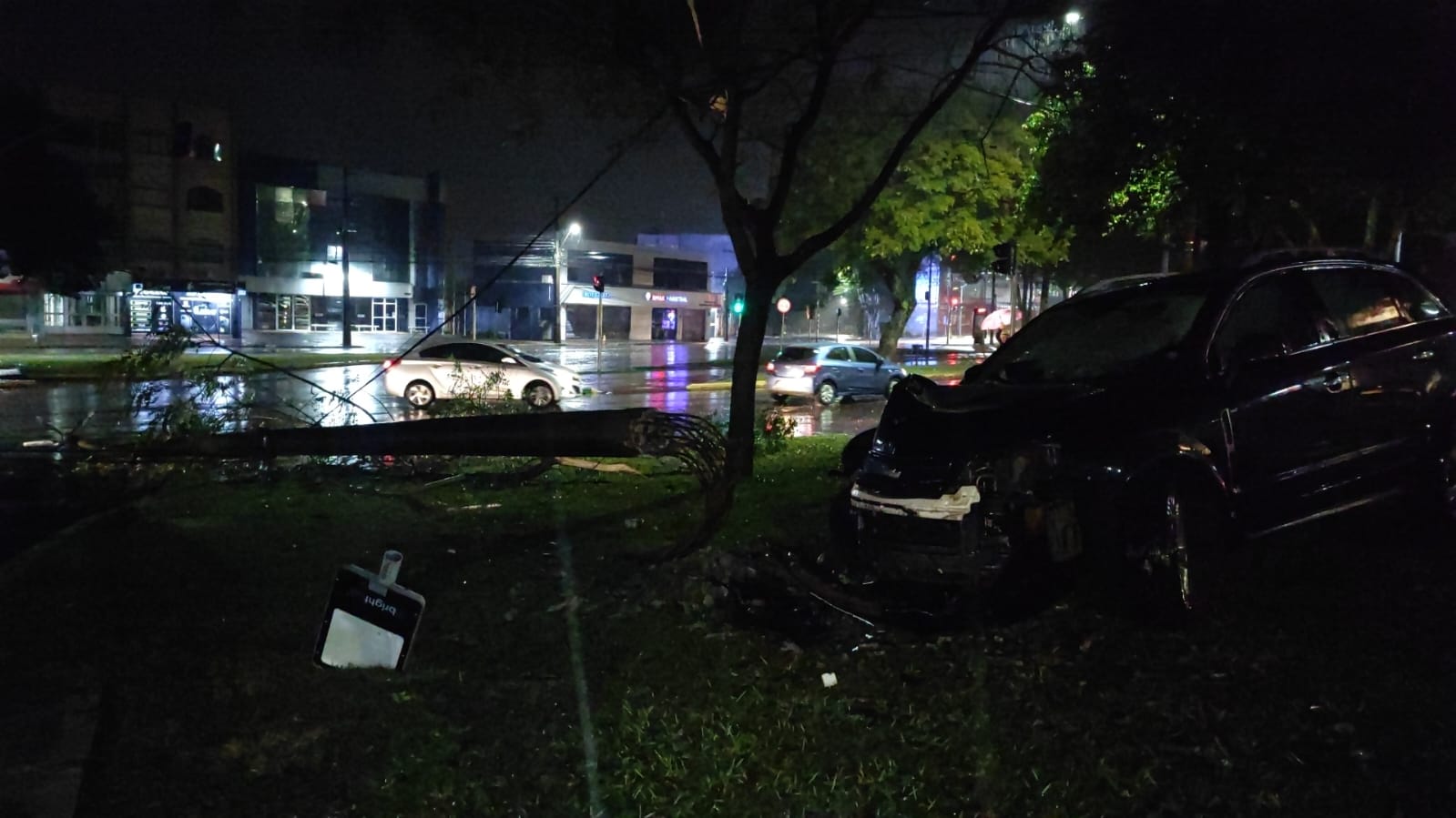 Um acidente envolvendo uma Chevrolet Captiva deixou um poste de energia, uma placa de sinalização, galhos e fios espalhados sobre o cruzamento das Avenidas Brasil com Barão do Rio Branco na manhã desta segunda-feira (04) em Cascavel.