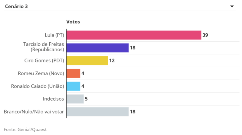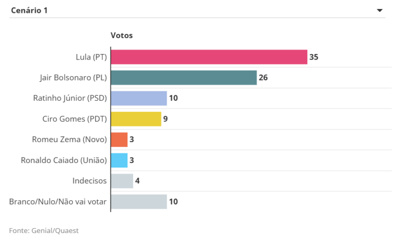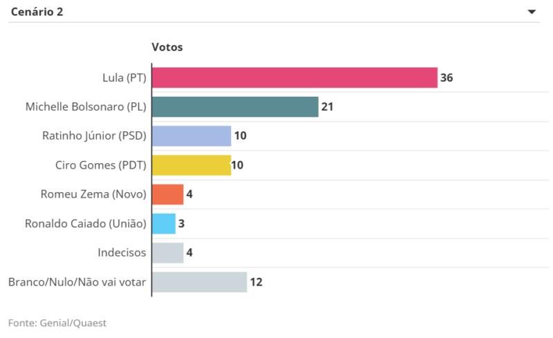 O ex-presidente Jair Bolsonaro (PL), que está inelegível e não pode participar do pleito, tem o melhor resultado contra o petista entre os nomes da direita testados. Bolsonaro teria 26%, contra 35% de Lula. A ex-primeira-dama Michelle Bolsonaro (PL), por sua vez, aparece com 21%, em um cenário no qual representa o campo, ante 36% do petista. Já o governador de São Paulo, Tarcísio de Freitas (Republicanos), soma 18% e 19%, a depender da lista de nomes, enquanto Lula marca, respectivamente, 39% e 42%.