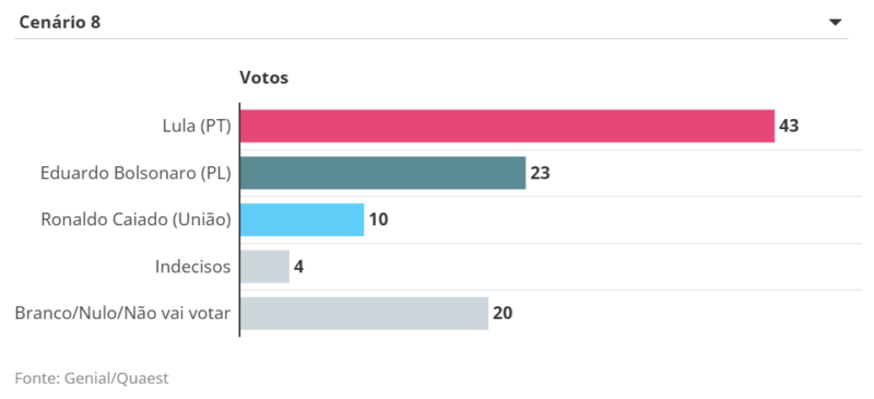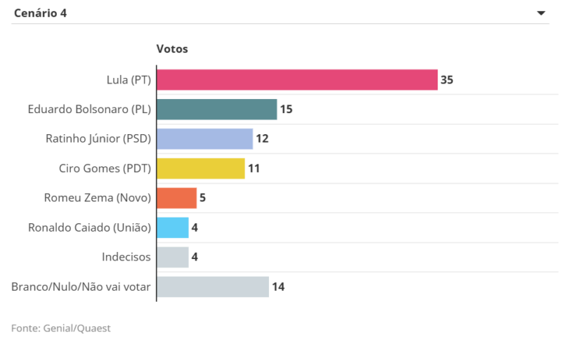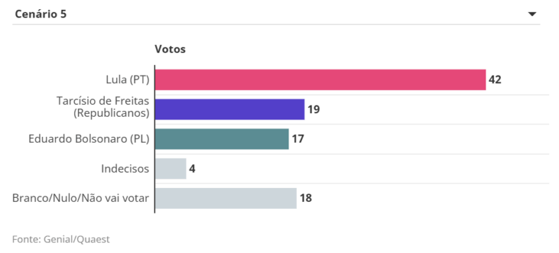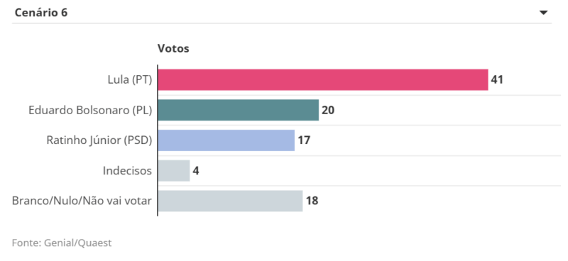 O deputado federal Eduardo Bolsonaro (PL), por sua vez, marca entre 23% e 15% em diferentes cenários contra Lula e outros nomes da direita. O parlamentar que vem articulando nos EUA sanções contra o Brasil e autoridades tem afirmado ter intenção de disputar, o que tem gerado atritos no bolsonarismo.