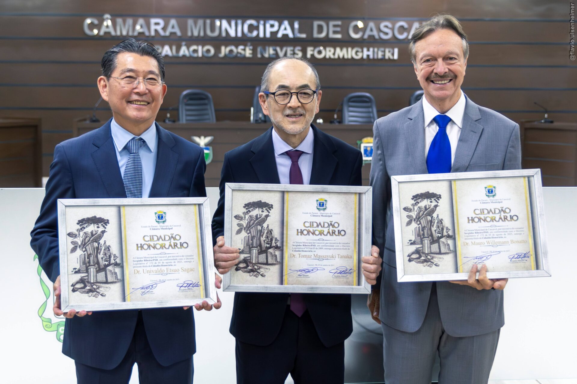 Em cerimônia realizada na noite de sexta-feira (03) no Plenário, a Câmara Municipal fez a entrega dos títulos de Cidadão Honorário aos três médicos fundadores da Gastroclínica, os doutores Tomaz Tanaka, Univaldo Sagae e Mauro Bonatto. O proponente das homenagens é o vereador Serginho Ribeiro (PSD).