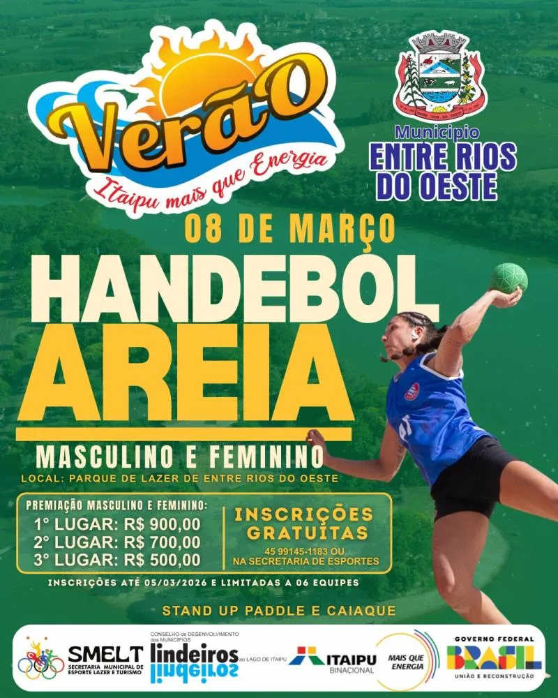 O município de Entre Rios do Oeste recebe, nos dias 7 e 8 de março, a etapa Verão Itaipu Mais que Energia 2026. O evento será realizado no Parque de Lazer (praia artificial) e contará com disputas nas modalidades Vôlei de Areia, Handebol de Areia e Beach Tennis, nas categorias masculina e feminina.