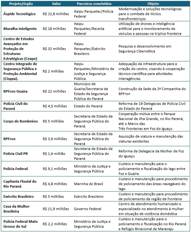 Alguns dos investimentos da Itaipu nas forças de segurança nos últimos anos somam quase R$ 150 milhões e devem ultrapassar os R$ 170 milhões em 2026. Confira no quadro em anexo.