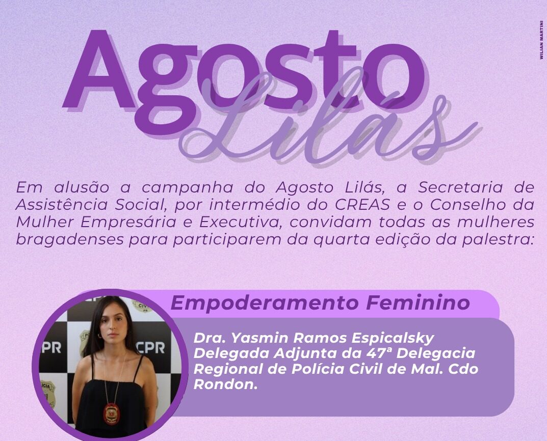 A Secretaria de Assistência Social de Pato Bragado, em parceria com o Creas e a Acibra Mulher, realiza no dia 18 de agosto de 2025, às 19h, no Clube de Idosos Felicidade, a quarta edição da palestra “Empoderamento Feminino”.