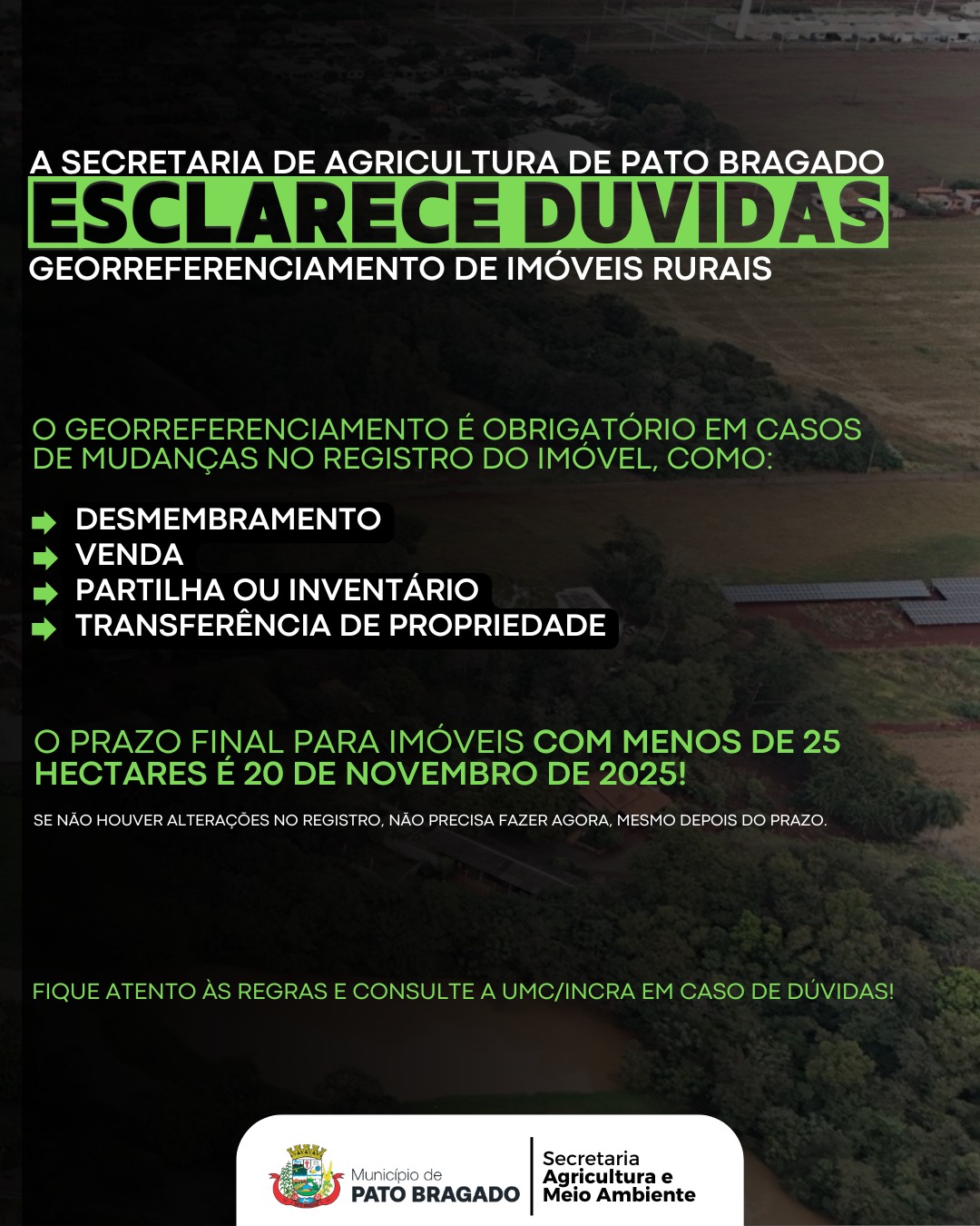 A Secretaria de Agricultura, Pecuária e Meio Ambiente de Pato Bragado, por meio da representante oficial da UMC – Unidade Municipal de Cadastro do INCRA, servidora Claudete Scaravonatto, vem esclarecer dúvidas sobre o georreferenciamento de imóveis rurais, conforme orientações obtidas em recente reunião no INCRA, em Curitiba, durante o lançamento do Programa Terra Cidadã, do Governo Federal.