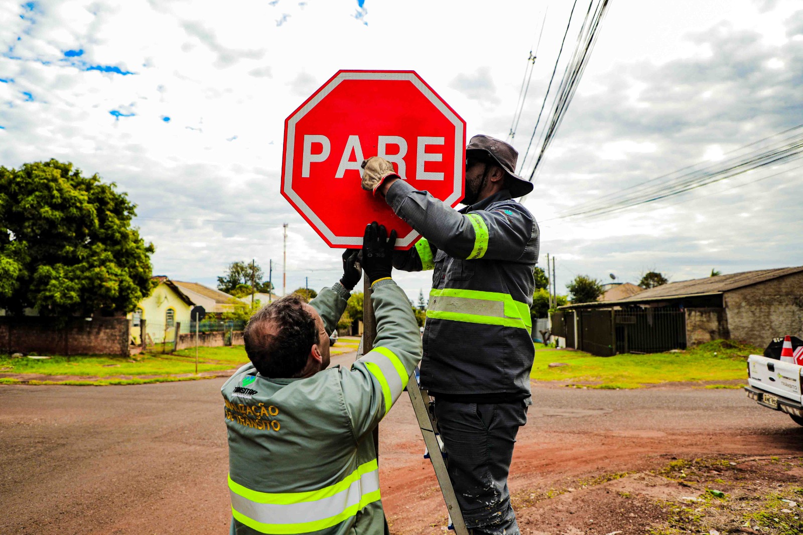A Prefeitura de Cascavel, por meio da Transitar, está avançando com os trabalhos de revitalização da sinalização viária em diversos bairros da cidade. A ação, iniciada em abril de 2025, já promoveu melhorias completas na sinalização horizontal e vertical do bairro Alto Alegre e segue em andamento no bairro Parque São Paulo.