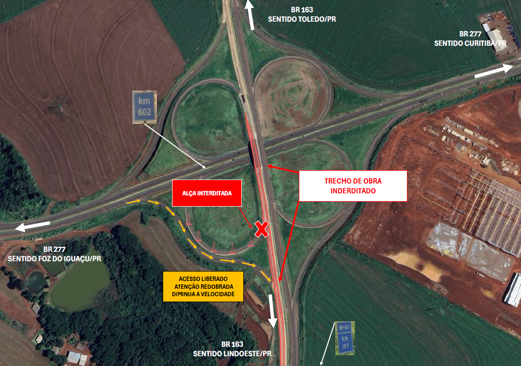 O fechamento da alça e a interdição parcial da pista (conforme o mapa) vão deixar o tráfego impedido para usuários que trafegam pela BR-163 e desejam acessar a BR-277, sentido Cascavel.